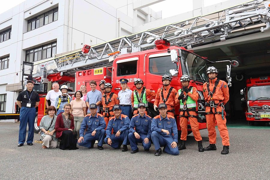Abbildung 1: Forscher*innen der Bergischen Universität Wuppertal, der Hochschule für angewandte Wissenschaften Würzburg/Schweinfurt und der Nagaoka University zu Besuch bei einer Feuerwache in der Präfektur Chiba @Ishii, Fire Department Chiba